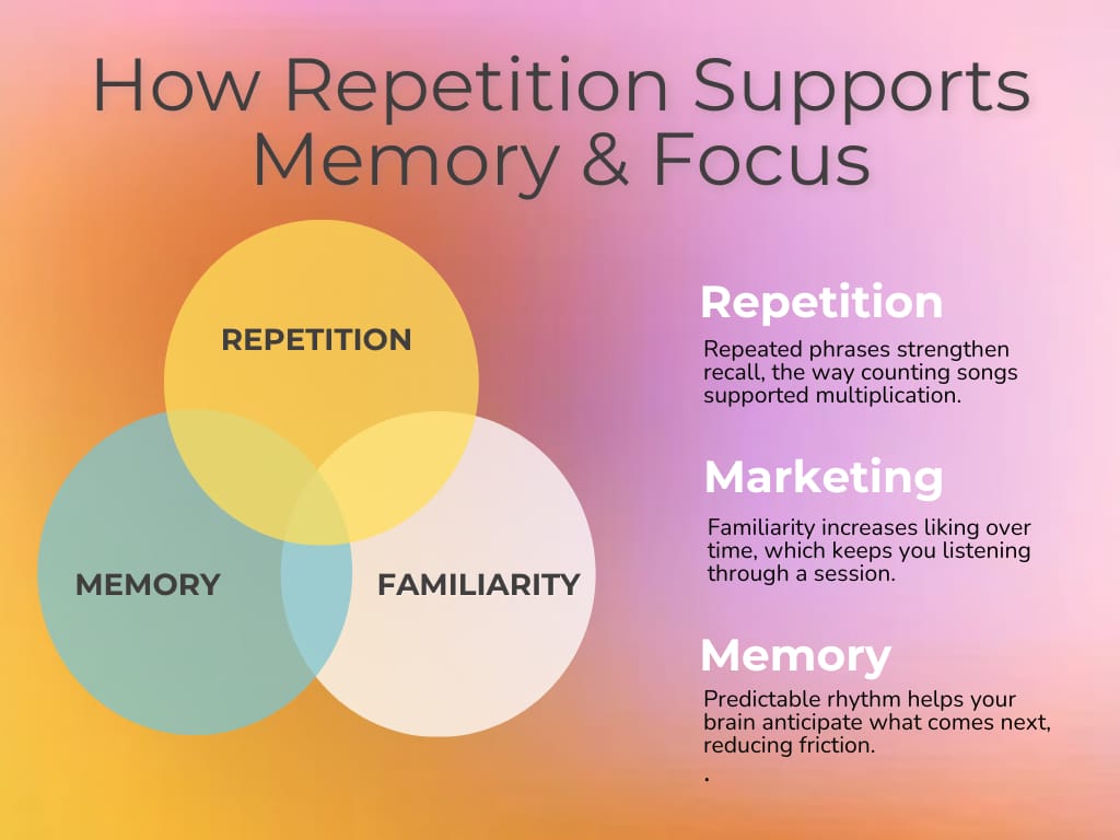 Repetition lowers the mental effort it takes to process a song. Familiar patterns create faster recognition, which frees attention for the task in front of you.
